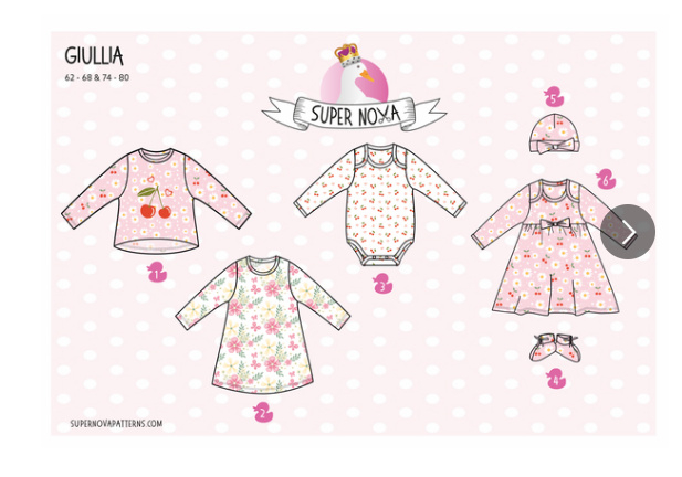 Patroon Giullia. Patroon met romper, jurkje, t-shirt, schoentjes en mutsje in de maten 62-68 en 74-80.
